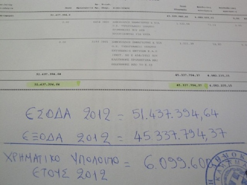 Ειδικότερα, τα έσοδα ήταν 51.437.394,64 ευρώ και τα έξοδα 45.337.794,37 ευρώ, δηλαδή πρέπει να υπάρχει χρηματικό υπόλοιπο 6.99.600,27 ευρώ .