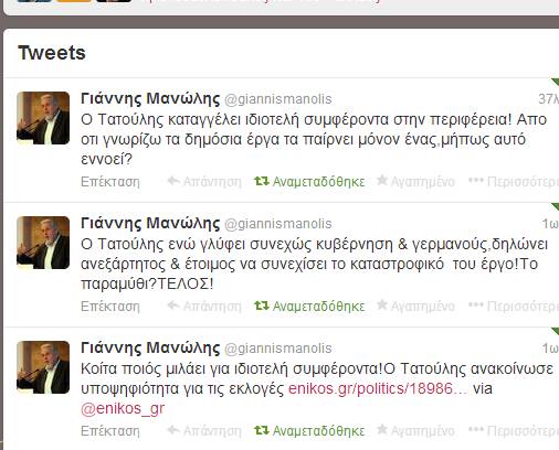 Μανώλης κατά Τατούλη μέσω twitterΓράφτηκε από την ΕΛΕΥΘΕΡΙΑ Online