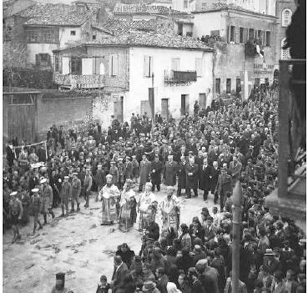 Το 1947 παραβρέθηκε στην εορτή της Υπαπαντής ο αρχηγός των Εθνικών Φιλελευθέρων και υπουργός Δημοσίων Εργων στην κυβέρνηση Δημ. Μαξίμου, Στυλιανός Γονατάς. Στη φωτογραφία η θρησκευτική πομπή μόλις ξεκινά από την οδό Υπαπαντής. Στην πρώτη σειρά διακρίνονται οι μητροπολίτες Μεσσηνίας Χρυσόστομος Δασκαλάκης, Αττικής και Μεγαρίδος Ιάκωβος, Πατρών Θεόκλητος και Ζιχνών Κύριλλος και ακολουθούν οι επίσημοι. Αριστερά, οι παλαιές οικίες με τις κεραμοσκεπές κατεδαφίστηκαν στη δεκαετία του 1950 για τη διεύρυνση της πλατείας του μητροπολιτικού ναού.