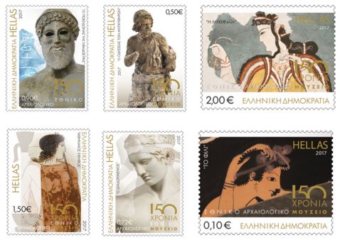 Η αναμνηστική σειρά γραμματοσήμων «150 χρόνια Εθνικό Αρχαιολογικό Μουσείο» (© ευγενής παραχώρηση ΕΛ.ΤΑ).