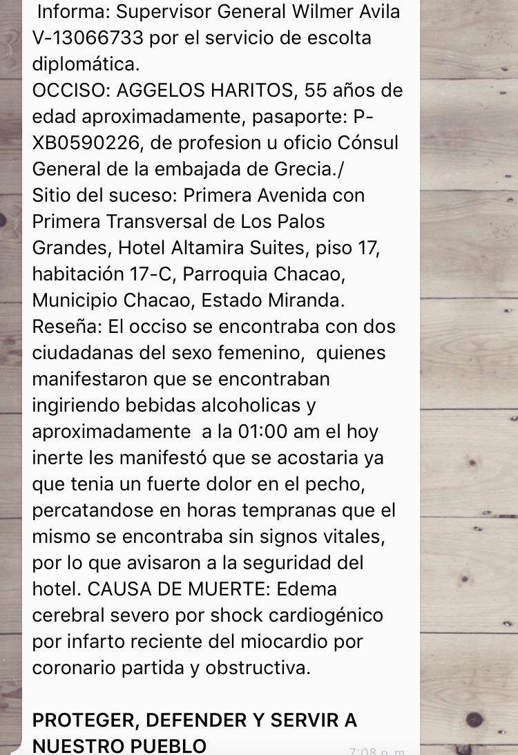 Ειδικότερα, δημοσιογράφος στη Βενεζουέλα αναδημοσιεύει στον προσωπικό του λογαριασμό στο Twitter το πόρισμα της αστυνομίας στο οποίο αναγράφονται μεταξύ άλλων τα αίτια του θανάτου του. Βάσει αυτού, ο Ελληνας διπλωμάτης φέρεται να υπέστη εγκεφαλικό οίδημα μετά από έμφραγμα του μυοκαρδίου γύρω στη 01:00 τα ξημερώματα της Πέμπτης (τοπική ώρα).